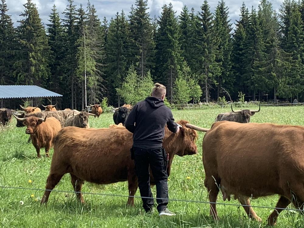 Saavuimme Hirvensalmelle, josta opas tuli mukaamme. Ensimmäinen kohde oli Havupirtti, sieltä jatkoimme tutustumaan kirkkoon ja ja syömään Sataman herkkuun. Kissakoskella tutustuimme alueen historiaan mutta emme valitettavasti päässeet museoon. Kukkaloiston ja ostosten jälkeen jatkoimme matkaa tilalle, jossa saimme ihailla upeita sarvipäitä Ylämaan karjaa. Paras osa reissusta.