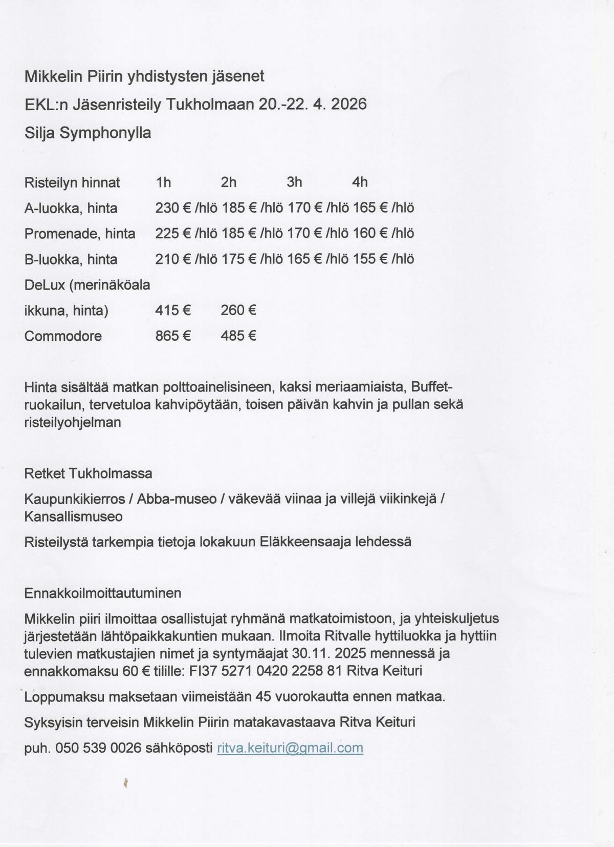 Yhdistys järjestää jäsenilleen retkiä, teatterimatkoja ja kulttuurimatkoja mahdollisuuksien mukaan. Myös vierailut muiden yhdistysten tapahtumiin kuuluvat ohjelmaan.